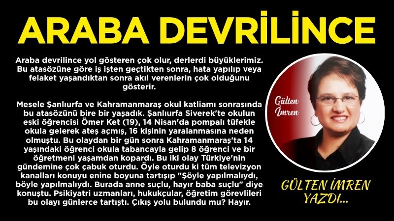 Mesele Şanlıurfa ve Kahramanmaraş okul katliamı sonrasında bu atasözünü bire bir yaşadık. Şanlıurfa Siverek’te okulun eski öğrencisi Ömer Ket (19), 14 Nisan’da pompalı tüfekle okula gelerek ateş açmış, 16 kişinin yaralanmasına neden olmuştu. Bu olaydan bir gün sonra Kahramanmaraş’ta 14 yaşındaki öğrenci okula tabancayla gelip 8 öğrenci ve bir öğretmeni yaşamdan kopardı. Bu iki olay Türkiye’nin gündemine çok çabuk oturdu. Öyle oturdu ki tüm televizyon kanalları konuyu enine boyuna tartışıp “Şöyle yapılmalıydı, böyle yapılmalıydı. Burada anne suçlu, hayır baba suçlu” diye konuştu. Psikiyatri uzmanları, hukukçular, öğretim görevlileri bu olayı günlerce tartıştı. Çıkış yolu bulundu mu? Hayır.