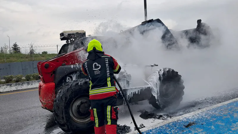 Sabah saatlerinde OSB bağlantı yolunda seyir halinde olan iş makinesinin motor bölümünden dumanlar yükselmeye başladı. Kısa sürede büyüyen dumanlar, şiddetli alevlere dönüştü. Aracın operatörü durumu fark ederek aracı yol kenarında durdurdu ve çevredekiler yardıma koştu.